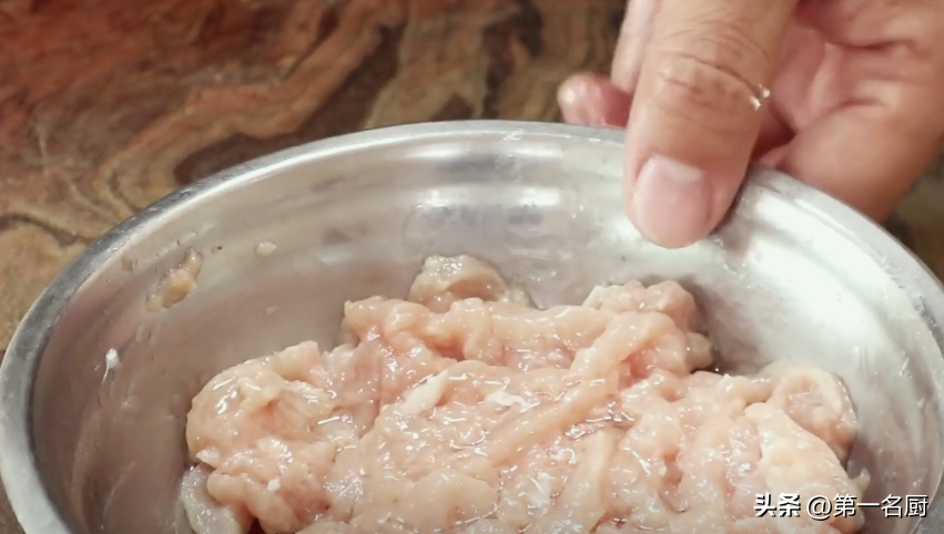 2.猪瘦肉一小块切成肉丝,放入盆中,加入少许食盐,米酒,胡椒粉,淀粉,抓拌均匀腌制15分钟。